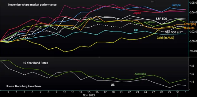 Domestically, gains were led by speculative areas of the market with small caps (S&P/ASX Small Ordinaries) surging 2.1%. Mid-caps (S&P/ASX Midcap 50) outperformed with a 1.3% return. These movements signal improvement in risk appetite locally. From a sector perspective, Healthcare and Information Technology were stand out performers. Globally stocks in Japan, Europe and other major markets also registered solid gains while Latin America provided the strongest returns. Argentinian stocks, though now little owned by foreign investors, jumped by 30% after the self-described anarcho-capitalist, Javier Milei, was elected as president.