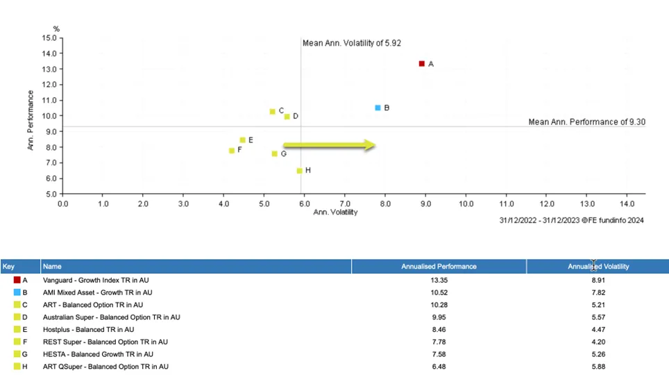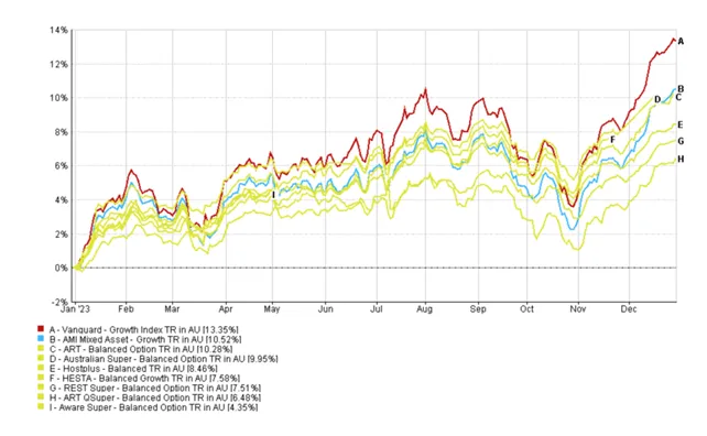 Along with the 2023 Year In Review piece we will also be doing a comms piece on peer group performance, including that of industry funds but in the meantime we noticed an article in the AFR in the past few days entitled “Super balances grow almost 10pc thanks to tech rally” that managed to include both of the following 2 sentences: