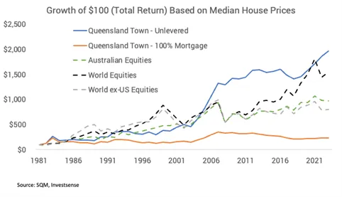 We have made some progress on an analytical project we have been doing that attempts to put the past performance and prospects for residential property investment in the same context as our Valuation Dashboard and multi-asset portfolio returns. There are quite a few nuances to work through including leverage, negative gearing and so on, but the following graphs demonstrate some of the output that we have come up with so far. This is based on a property that has been bought outright in a large rural Queensland town which has, on average yielded a 4% gross rental yield with a 3% carrying cost. At the other end of the spectrum, we show a version which is perpetually negatively geared with average interest rates of 8%. These are extremes but perhaps not wholly unrealistic these days.